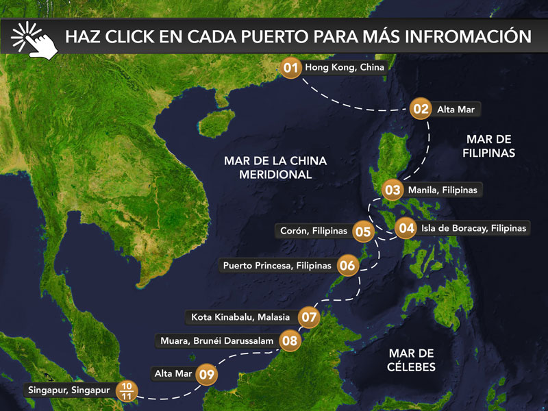Comienza en Hong Kong, disfruta del pulso romántico e histórico de Manila, y encuentra besos lentos en las aguas turquesa de Boracay. Descubre las lagunas escondidas de Corón y la sensualidad de Puerto Princesa. Piérdete en los mercados exóticos de Kota Kinabalu y ríndete al misterio silencioso de Muara, antes de llegar a la elegancia futurista de Singapur.